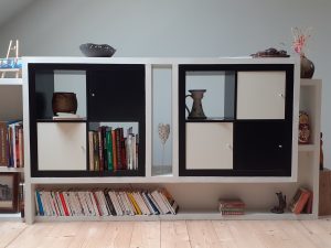 Bibliothèque sur mesure intégrant des meubles ikéa et servant de garde-corps à un escalier